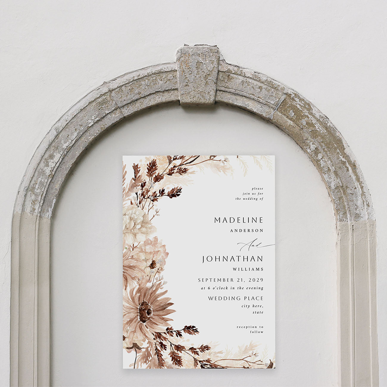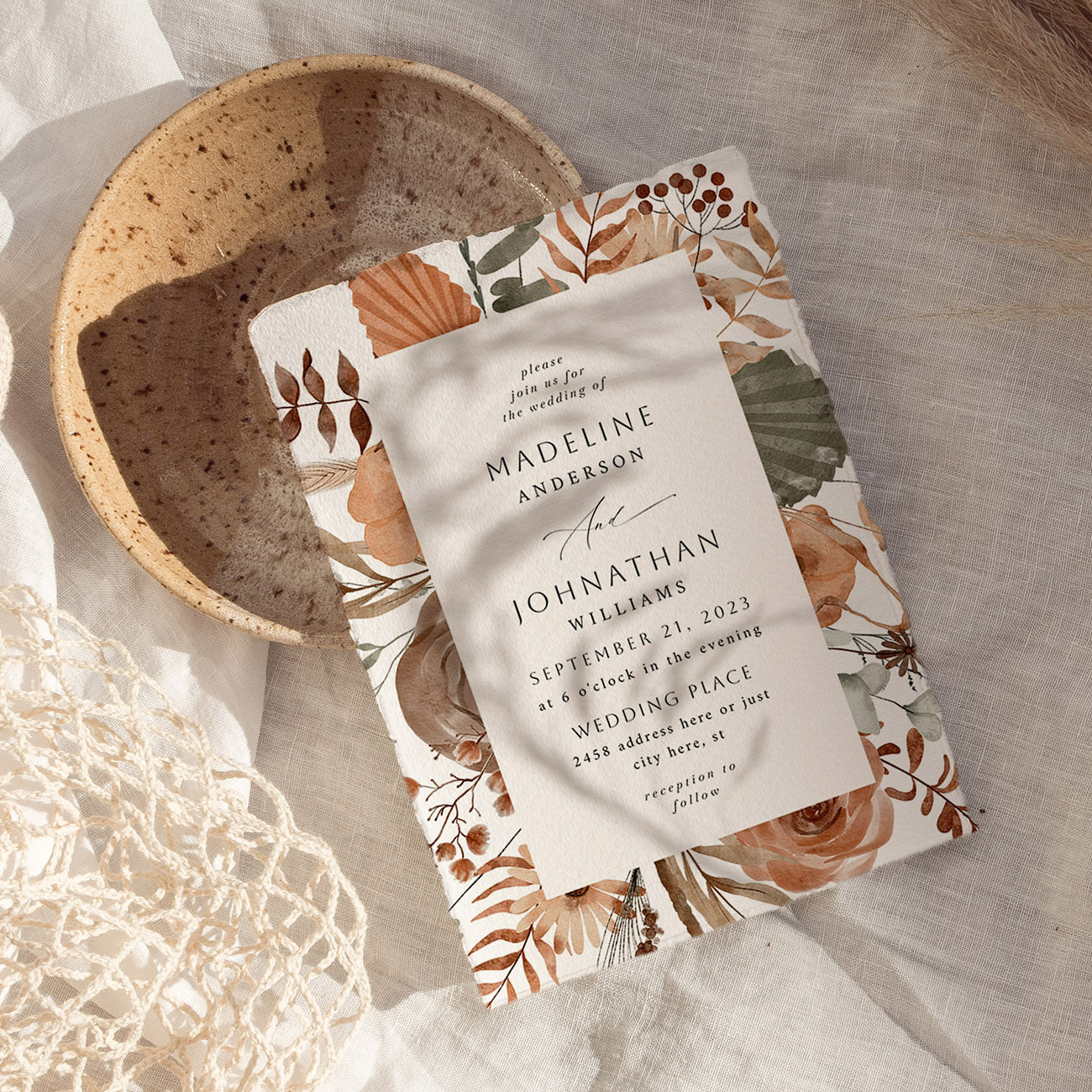 This orange, red, and pink floral (flowers) wedding invitation was created by hand painted, watercolors then scanned to create an artist designed wedding invitation.  It's a great fit for fall weddings with the red and orange colors with a touch of pink or boho weddings with the red and orange, natural colors. This downloadable invitation allows you to save money on the design and send as is or print it wherever you'd like.
